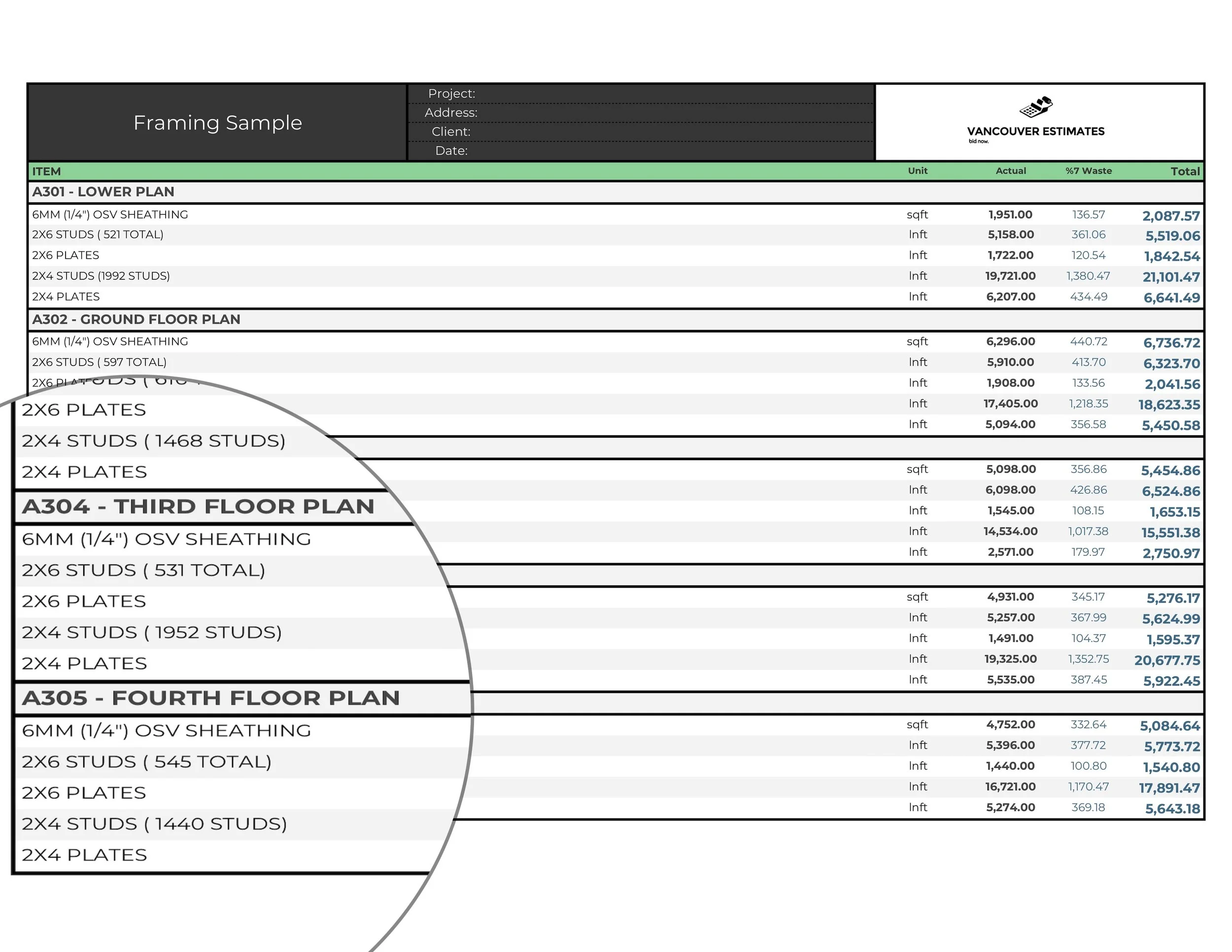 Vancouver Estimates provides material take-offs for for every phase of framing including construction and installation of floor joists, sub flooring, exterior walls, interior support wall frames and stairs, exterior door frames and doors, roof rafters, trusses, and sheathings.